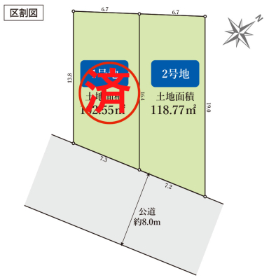 | 現況/引渡し | 更地/即時 | 接道状況 | 接道: 西 公道 道路幅: 3.38m |